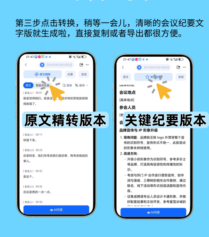 结果是实的较着!伴侣他们之前拾掇一次纪要要俩⼈一天,现正在一小我俩小时就够,错误率还降了九成。好比前次会议有个从管说“冷链运输要加测温度记实”,之前人工转成“冷鲜运输”,仍是带领查抄才发觉;用听脑AI间接标对了“冷链运输”,压根不消回头改。还有一次会议俩小时,人工拾掇得翻三遍录音,用它十分钟就出了摘要,沉点全正在里面,伴侣说现正在再也不消熬夜赶纪要了。